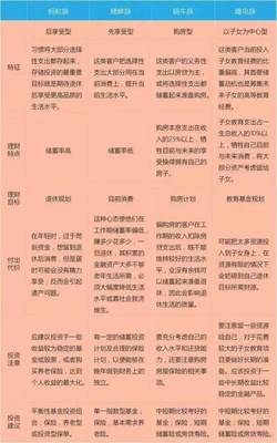根据对义务性支出和选择性支出的不同态度,可以划分为后享受型(蚂蚁族)、先享受型(蟋蟀族)、购房型(蜗牛族)和以子女为中心型(慈鸟型)四种比较典型的理财价值观。以下图表就是这4种理财价值观的理财特点及使用的投资品种。