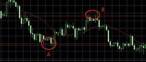 如上图所示,如果提前预判到A区域为支撑位,B区域阻力位,在附近交易时,在A区域之前,水平线的上方进场做多,在A处水平线的下方设置止损点,因为会有一部分价格突破水平线;在B处水平线下方进场做空,并且如果在最靠近A水平线上方的位置进场最佳,止损点设在B水平线之上的位置。