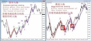 当以“ 1-2-3”反转形态进行交易时,如果左侧图表中点2在趋势方向被突破,交易者就可以保守地方式入场。