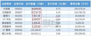 8家实施定增统计期内,大悦城(000031,股吧)(000031)、云铝股份(000807,股吧)(000807)、星期六(002291,股吧)(002291)、*ST河化(000953)、南纺股份(600250,股吧)(600250)、沃施股份(300483,股吧)(300483)、ST慧球(600556)、岷江水电(600131,股吧)(600131)8家上市公司实施增发,募资总额合计约132.13亿元。