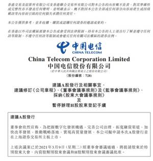 3月9日消息,中国电信当日晚间公告,为把握数字化发展机遇,完善公司治理,拓宽融资渠道,加快改革发展,推动战略落地,实现高质量发展,公司拟申请A股发行并在上海证券交易所主板上市。