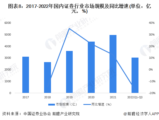 根据中国证券业协会数据,2017年至2021年,国内证券业市场规模从3113.28亿元增长至约4967.95亿元,年均复合增速达12.4%,主要受益于我国经济发展带来的资本市场扩大。2022年前三季度国内证券行业市场规模约3042亿元,同比下降16.95%,主要系2022年疫情升级、俄乌冲突以及美联储加息等因素致使市场遇冷。