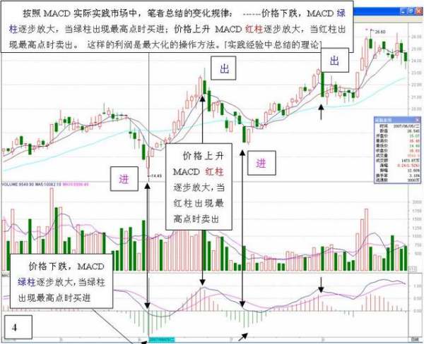 有一点要注意的是,在实践市场中,MACD的变化有这么一个规律;价格下跌,MACD绿柱逐步放大,当绿柱出现最高点时(最长绿柱),价格也对应出现波段低点。