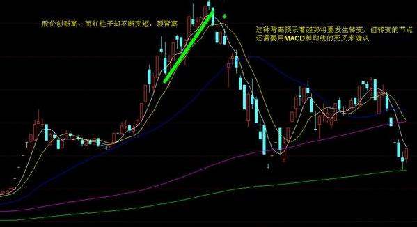 顶背离就是当股价创出了阶段性新高的时候,MACD柱子峰值却在减少,这明显是相反的方向,就形成了顶背离,紧接着股价会结束上涨走势,然后转为震荡下行。在一般情况下,MACD的DIF会跟随着股价的走势同涨同跌的。在正常的情况下应该是同样能创新高,同样跟随创新低。背离指的就是如果股价创出新高,但是DIF不创新高以及股价创出新低,DIF不创新低的情况。前者就是顶背离,是看跌的,后者就是底背离,是看涨的。此外MACD还有其他指标。MACD指标的基本看法总结起来就是“死叉买,金叉卖”。意思就是当MACD出现金叉的时候,DIFF会由下向上突破DEA,是做多信号。MACD出现死叉的时候,DIFF会由上向下突破DEA,是做空信号。当MACD由下转上的时候,MACD值由负变正,市场会由空头转为多头。当MACD由上转下的时候,MACD值由正变负,市场会由多头转为空头。当DIFF与DEA均为正值的时候,也就是都在零轴线以上的时候,大势属于多头市场,DIFF向上突破DEA,是做多信号。当DIFF与DEA均为负值的时候,也就是都在零轴线以下的时候,大势属于空头市场,DIFF向下跌破DEA,是做空信号。当DEA线与K线趋势发生背离的时候是反转信号。注意DEA在盘整局面时失误率是较高的,但如果配合RSI以及KD指标可适当弥补该缺点。
