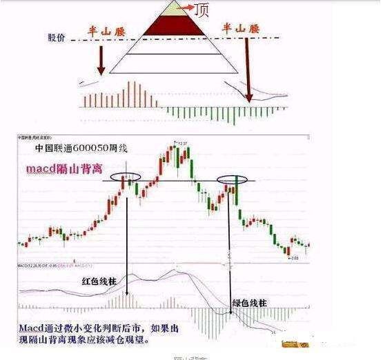如图,中间那个顶,我们就称为“山”,左右那两个高点,中间隔着一座山,前提是左边的半山要与右边的半山腰在一个水平位置上,左边对应出现的MACD红柱,右边对应出现MACD绿柱,就称为隔山背离。