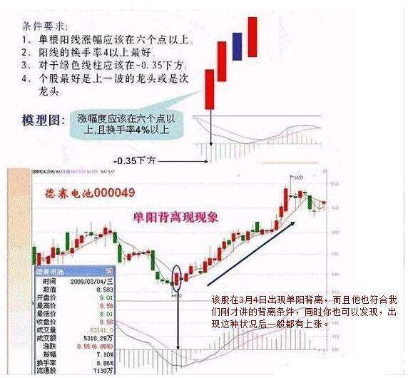 利用一根阳线来判断背离状况,首先我们看到的是一根在日K线下的阳线本应该是对应红色线柱,但在一定的特殊情况下便出现绿色的线柱,,从而也会出现了单阳背离的状况。单阳背离的使用需要一定的条件,如图中所讲: