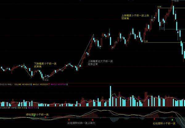 1. 股价上涨过程中,MACD红柱体面积小于前一波上涨时的红柱体面积,对应的上涨幅度也比前一次缩小,为顶背离,卖出信号;股价下跌过程中,MACD绿柱体面积小于前一波下跌时的绿柱体面积,对应的下跌幅度也比前一次小,为底背离,买入信号。常见于短时间分析周期,比如5分钟,30分钟等,多用于短线交易。