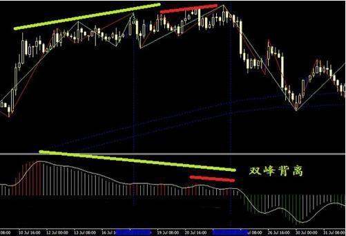macd指标的背离有顶背离和底背离两种;顶背离当股价k线图上的股票走势一峰比一峰高,股价一直在向上涨,而macd指标图形上的由红柱构成的图形的走势是一峰比一峰低,即当股价的高点比前一次的高点高、而macd指标的高点比指标的前一次高点低,这叫顶背离现象。顶背离现象一般是股价在高位即将反转转势的信号,表明股价短期内即将下跌,是卖出股票的信号。