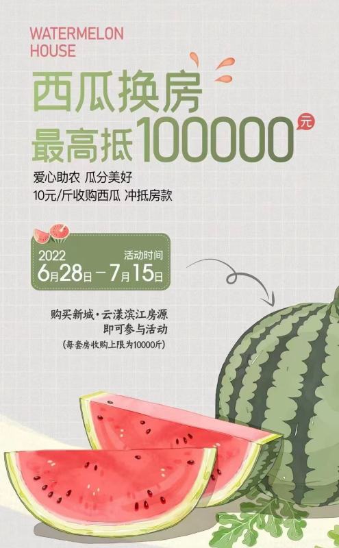 通过6月28日江苏南京一楼盘推出了“西瓜换房”活动宣传中的海报可以得知营销细节为:西瓜可以10元一斤的价格冲抵房款,每套房收购上限为1万斤,对应10万元房款,活动的时间期限为18天,到7月15日结束。