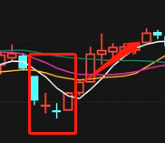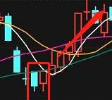 冉冉上升是指在横盘整理中,由八根或者更多的K线组成,其中阳线数量多于阴线数量,掺杂着十字星K线。