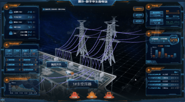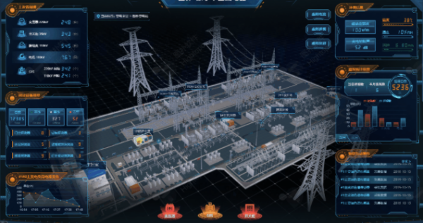 放个例子更容易理解,Hightopo围绕电力系统发电、输电、变电、配电、用电全流程搭建的智慧电网三维可视化解决方案,主要是对电网设备进行智能监测,对电网进行维护。