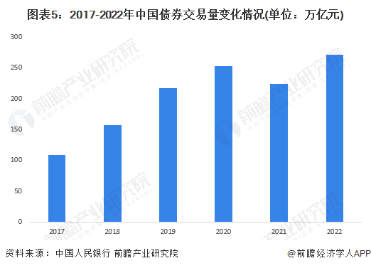 从债券交易市场来看,2017年至2022年,我国债券交易量保持较高增速,从108万亿元增长至约271万亿元,年均复合增速达20.1%。2022年中国债券交易量达271.2万亿元,同比增长20.8%。