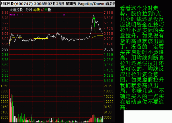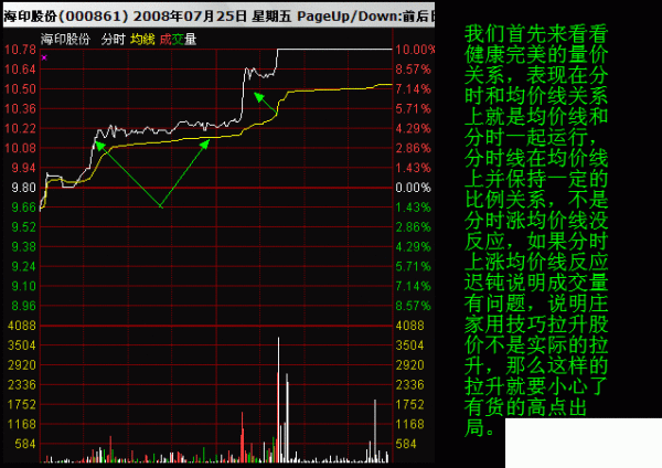 在看分时图中很重要的一点就是看分时线和均价线的位置关系,健康完美的分时线和均线运行状态是,分时线运行在均价线上并保持一定的比例关系,当分时线上涨是均价线应该跟上,如果分时上涨均价反应迟钝是一种异常,说明有资金虚假拉升或者为了出货拉升,这样的我们就在高点出货。