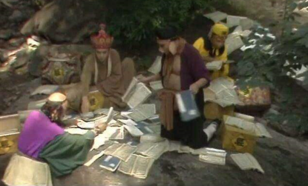 师徒四人回返途中,重遇通天河老龟。老龟曾托唐僧向佛祖打问自己的归宿,不想唐僧忘却了此事。老龟一怒,沉下河去。师徒们挣扎着上了岸,又得八戒用耙捞上经包,在石上晾晒经文,不料不少经页沾在了石上。