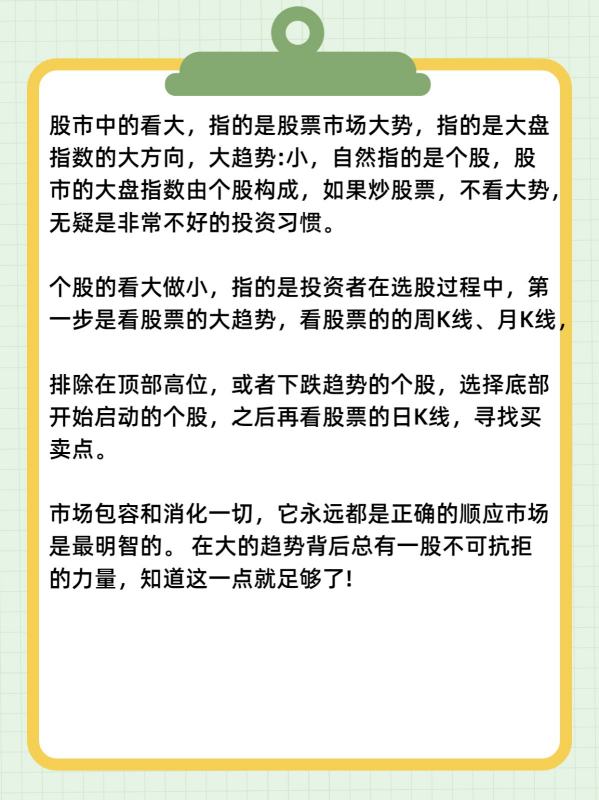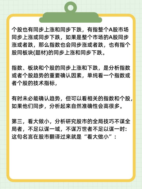 第三,看大做小,分析研究股市的全局技巧不谋全局者,不足以谋一域,不谋万世者不足以谋一时:这句名言在股市翻译过来就是“看大做小”:股市中的看大,指的是股票市场大势,指的是大盘指数的大方向,大趋势:小,自然指的是个股,股市的大盘指数由个股构成,如果炒股票,不看大势,无疑是非常不好的投资习惯。