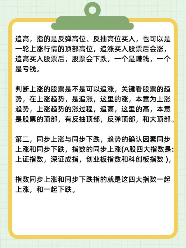 追涨和追高,股票有一个共同点,那就是股票在涨,追涨,意思是在股票开始一轮行情上涨过程中,属于上涨阶段买入。