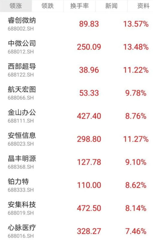 8月份第一个交易日,a股市场开局良好,尤其是科技创新板块。截至午盘收盘,科创50指数上涨5.92%,明显领先于a股其他主要股指。主要a股指数早盘表现良好50只成份股全部上涨,锐创微纳、中威公司、西部超导早盘均上涨10%以上。科技50成份股涨幅排名。