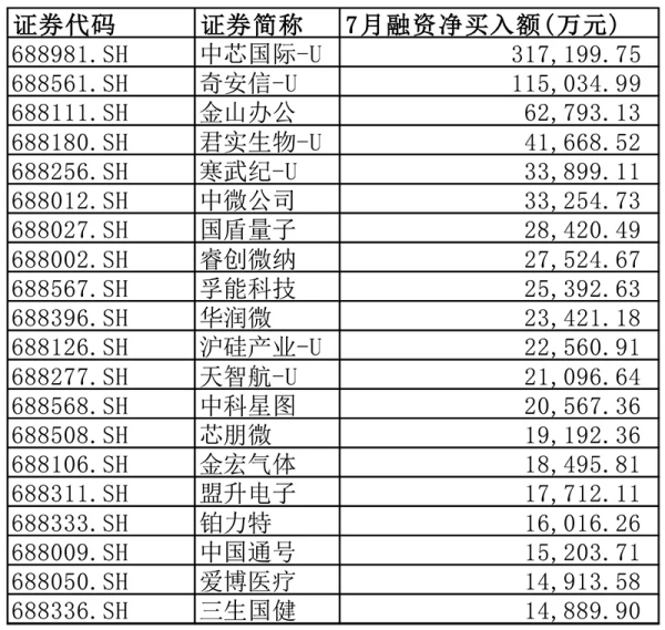 个股方面,SMIC、祁安信、金山办、君实生物、寒武纪7月份净买入排名前五。其中,SMIC以7月份31.72亿元的净融资购买量排名第一,齐安欣以11.50亿元的净融资购买量排名第二。
