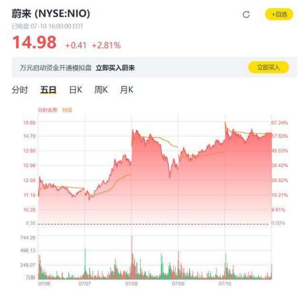 受益于几大利好消息,截至当地时间7月10日美股收盘,蔚来汽车的股价再次大涨13.12%,报收于14.57美元。