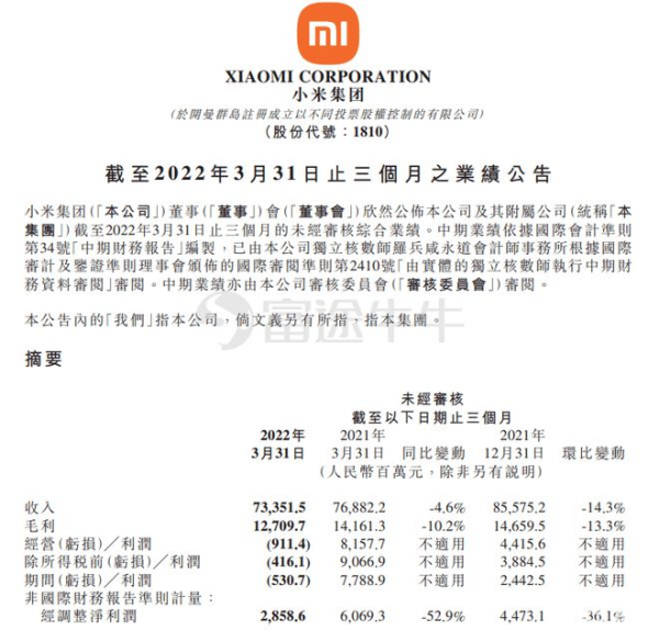 上个月小米科技有限责任公司发布了2022年财报,财报显示,2022年小米收入为2,800亿元,经调整净利润达到人民币85亿元,同比下降61.4%。利润下滑的主要原因为主力业务智能手机收入下滑,分部收入由截至2021年12月31日止年度的人民币2,089亿元减少19.9%至报告期的人民币1,672亿元。