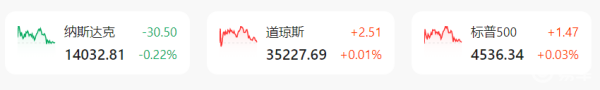 美国时间周三,美股收盘主要股指继续全线上涨,道琼斯指数收于35061.21点,上涨109.28点,涨幅0.31%;标准普尔500指数收于4565.72点,涨幅0.24%;纳斯达克指数收于14358.02点,涨幅0.03%。道指实现连续八个交易日上涨,而三大股指均创2022年4月以来的新高。