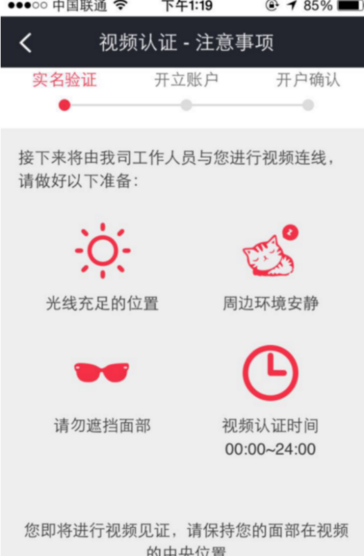 进行视频认证,选择光线充足的位置,确保听筒与话筒可用,与证券公司工作人员进行视频会话,根据其提问进行相应回答。