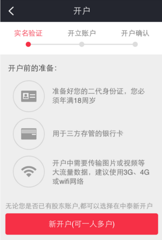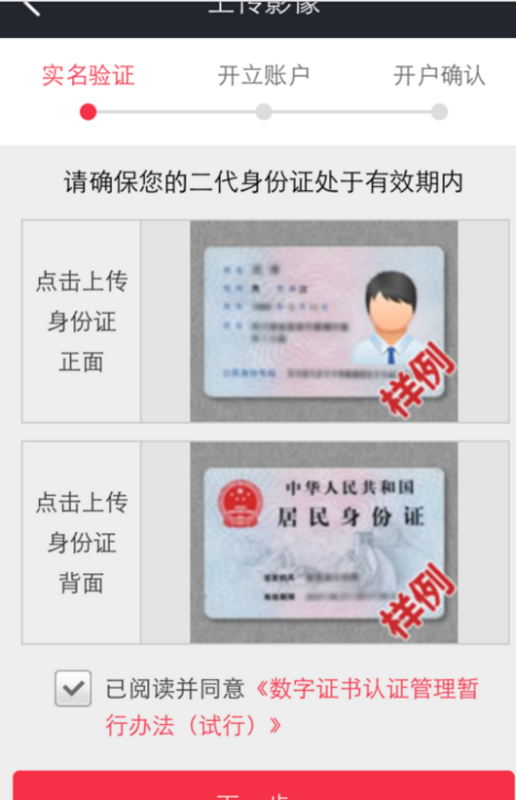 扫描身份证正反面,各家券商目前仅支持二代身份证,然后对照身份证上的个人信息检查系统自动录入的信息,这里信息必须一致才可进入下一步。