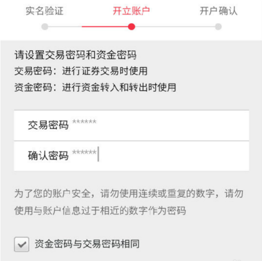 设置资金账户密码,这个密码非常重要,是你将来交易股票所用账户的密码,因此一定要记牢。密码为6位数字组成,不允许连号或者三位以上重复数字的出现。