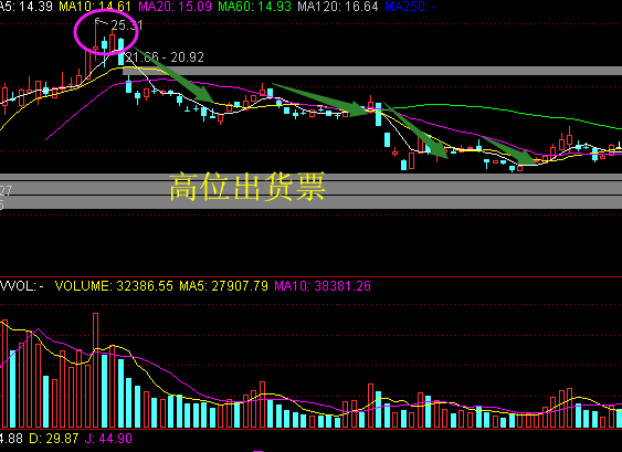 如上图,这只股票前期已经大涨5倍多了,从几元主升浪后暴涨到25元,这种高位票见顶之后主力会疯狂出货的。类似这种高位出货票一定要出局,不管是亏损10%,还是亏损20%,能尽早出局是最好的。