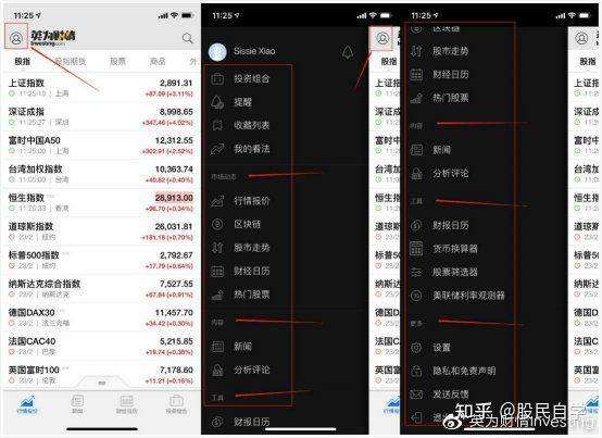 英为财情的APP和国内主流的设计不太一样,(此处需要划重点!!)所有的内容都隐藏在左侧边栏,点击左上角的头像即可打开。