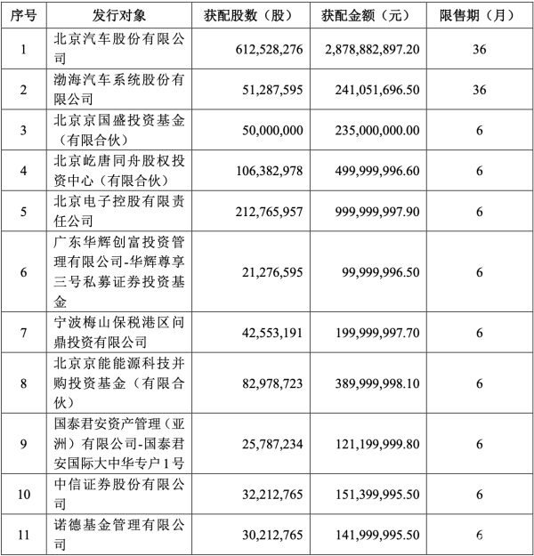 本次发行价格为4.70元/股,发行对象最终确定为12家,其中北汽蓝谷的控股股东北汽集团控制的关联方北京汽车、渤海汽车分别获配612,528,276股和51,287,595股,获配金额分别为287,888.29万元和24,105.17万元,限售期36个月;其余股份由另外10名发行对象认购,限售期均为6个月。