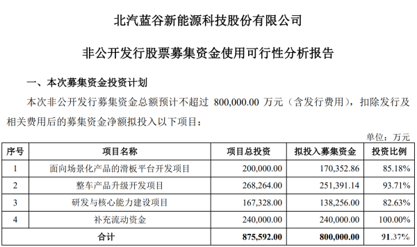 公告显示,北汽蓝谷本次募集资金将主要用于面向场景化产品的滑板平台开发项目、整车产品升级开发项目、研发与核心能力建设项目和补充流动资金。