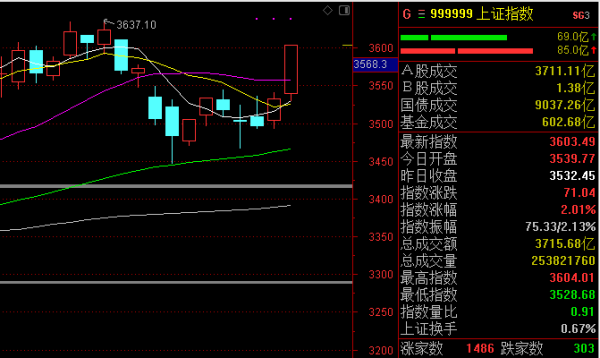 综合以上四个因素进行分析得知,预测明天会冲高回落,总体保持一个区间来回震荡的走势,总体会以3600点为重心,围绕这个重心徘徊震荡。