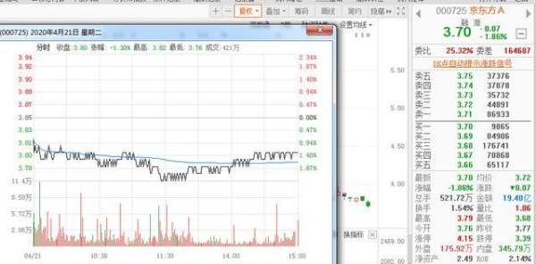 我们再看农业今日成交金额在2亿元,而2亿元放在一些小盘股中,很多个股波动幅度起码在5%上下,比如之前一段时间京东方A每天成交相对较为活跃,现在每天的成交金额在十几二十亿元的情况,但我们看到其分时图波动也经常出现几分钱的波动情况,具体参考下图案例: