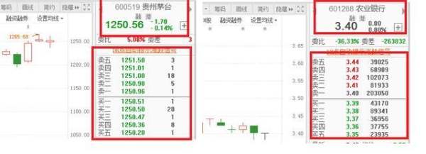 贵州茅台和农业银行的市值都很大,目前市值都在1万亿以上,而由于农业银行的股价较低,盘口挂单的成交相对较为密集,茅台相对较高挂单相对较为分散,甚至在买卖五档中可以看到还存在断档的情况,卖一为1250.96元,而卖二是1250.98元,中间的1250.97的档口就缺失了,而我们看农业银行肯定不会出现这类情况