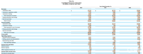 据特斯拉向美国证券交易委员会(SEC)递交10-K年报文件显示,2022年特斯拉总营收814.62亿美元,同比增长51.35%,其中汽车销售营收672.10亿美元,同比增长52.32%。净利润125.83亿美元,同比增长127.79%。