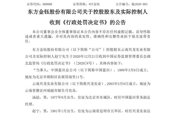 在《行政处罚决定书》([2020]8号)中,证监会查明,中国蓝田总公司在1999年已与农业农村部(原农业部)脱钩,并无股权投资关系。在收购东方金钰控股股东兴龙实业100%股权时,中国蓝田提供的信披资料将公司性质定为“全民所有制企业、投资人为农业部”,导致东方金钰在2019年2月2日发布的临时公告中存在虚假记载。