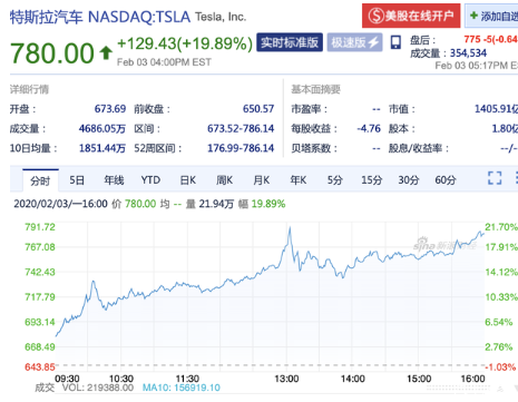 北京时间2月4日清晨,也就是美国时间的2月3日的傍晚,特斯拉在纳斯达克的估价暴涨了19.89%,收盘价格为780美元(开盘价格为673.69美元),创下了自2003年以来最大的单日涨幅纪录。一天之后,美国时间2月5日更是达到了845.98美元的新高,总市值超过1400亿美元。