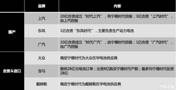 对于宁德时代,相信打算购买电动车的用户多少会听说过,就是一家专门为汽车提供电池的企业,大家可以暂且将其理解为汽车界的南孚。而它也是为市面上不少新能源车企提供动力电池的企业。目前与它所合作的主要汽车品牌都有哪些?可见下表: