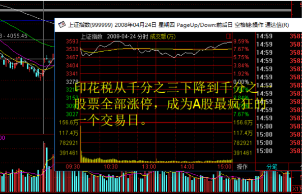 中国股市距离上一次下降印花税是2008年4月24号起股票交易印花税税率由3‰下降为1‰,当天A股走出了历史最疯狂的一天,全部股票涨停,上证大盘304个点,涨幅9.259%,成为A股历史最疯狂的一个交易日;可想而知股市对于下调印花税影响有多大?