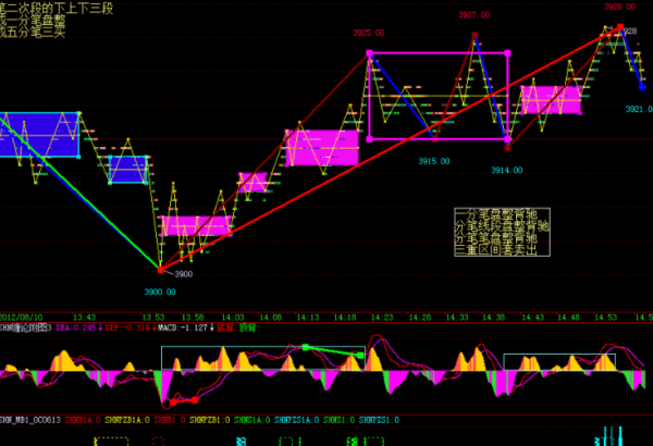 用MACD判断背驰:首先要有两段同向的趋势。同向趋势之间一定有一个盘整或反向趋势连接,把这三段分别称为A、B、C段。显然,B的中枢级别比A、C里的中枢级别都要大,否则A、B、C就连成一个大的趋势或大的中枢了。A段之前,一定是和B同级别或更大级别的一个中枢,而且不可能是一个和A逆向的趋势,否则这三段就会在一个大的中枢里了。