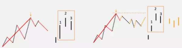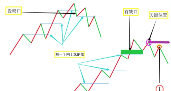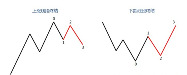 在上涨趋势中:当某一笔无法创出左侧临近高点的新高,且下一笔创出左侧低点的新低,则意味着上涨线段被终结;