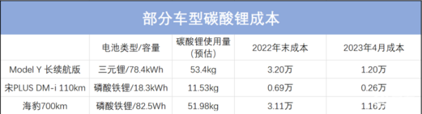 我们以Model Y 长续航版、宋PLUS DM-i 110km、海豹700km版本所搭载的电池包为例,它们搭载的电池类型及容量如上图。按照今年4月份与去年年末的电池级碳酸锂差价来计算的话,Model Y的电池成本下降2万元,宋PLUS DM-i下降0.43万元,海豹下降1.95万元。