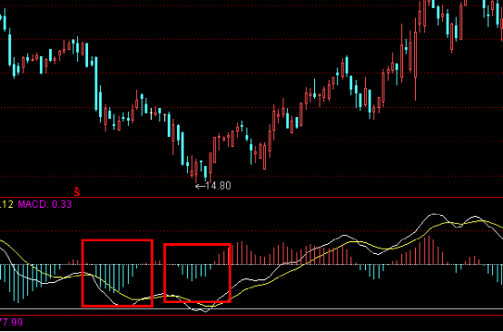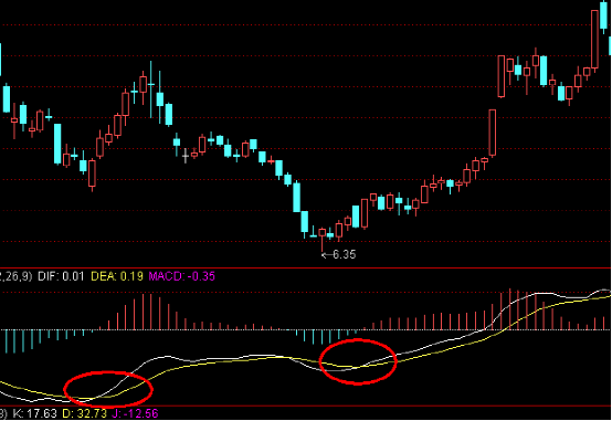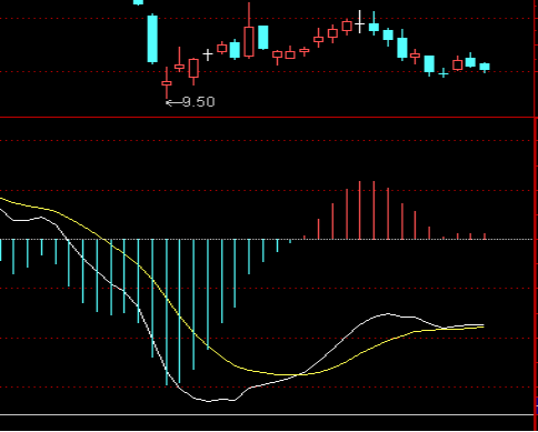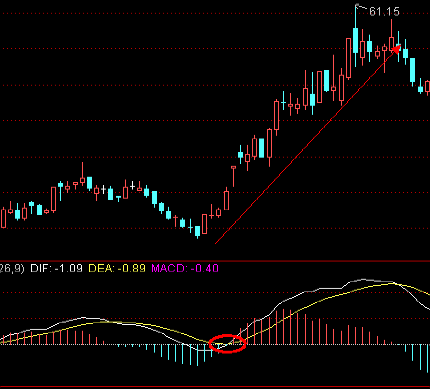 2、当快线和慢线在零轴以下金叉,是反弹行情。它表示股价经过很长一段时间的下跌,并在低位整理后,一轮比较大的跌势后、股价将开始反弹向上,是短线买入信号。对于这一种“金叉”,只是预示着反弹行情可能出现,并不表示该股的下跌趋势已经结束,股价还有可能出现反弹行情很快结束、股价重新下跌的情况,因此,投资者应谨慎对待,在设置好止损价位的前提下,少量买入做短线反弹行情。如下图:
