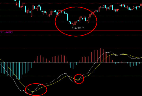1、底背离:底背离一般出现在股价的低位区。当股价K线图上的股票走势,股价还在下跌,而MACD指标图形上的由绿柱构成的图形的走势是一底比一底高,即当股价的低点比前一次低点底,而指标的低点却比前一次的低点高,这叫底背离现象。底背离现象一般是预示股价在低位可能反转向上的信号,表明股价短期内可能反弹向上,是短期买入股票的信号。