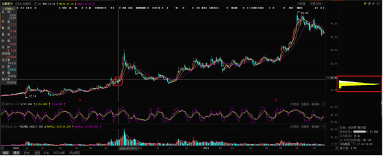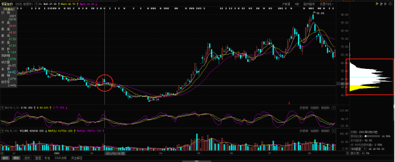 由图可得,筹码分布图由黄色区域、白色区域和绿线组成。其中,黄色表示获利盘,套牢盘用白色表示,那么。那条绿线则表示的是筹码的平均成本。其实筹码图的区域是由一条条长短不一的筹码柱子组合而成的。每一根横向的筹码柱子意思就是表示当前价格,然而,柱子的长短则是表示这个价位所对应的成交量是多少,柱子越长代表成交量越大。在某个价位附近,如果成交量特别多产生了一个小山头,我们把这种山头称为筹码峰。