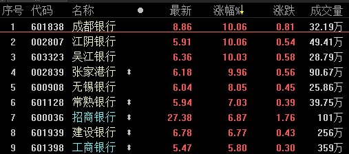 银行股方面,其中成都银行、吴江银行等封涨停,权重四大国有银行中,建设银行暴涨6.77%,工商银行涨5.8%,而另外商业银行方面,龙头股招商银行、平安银行也分别涨超6%和4%。