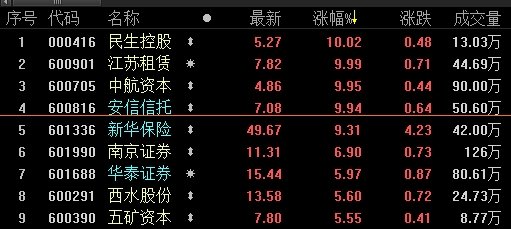 非银金融板块方面,安信信托、新华保险等涨超9%;华泰证券、中国太保涨超5%;中国平安涨超3%。