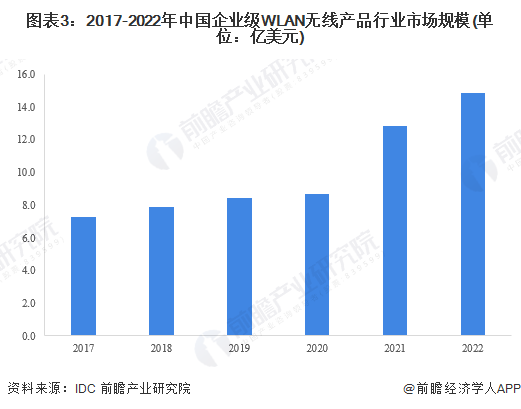 根据IDC数据,2021年以来,随着设备技术的快速发展,WLAN无线产品市场规模快速提升,2021年国内无线产品市场规模增长47.2%。2022年中国企业级WLAN无线产品规模增长16%,市场规模接近15亿美元。