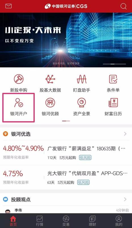 2、打开“中国银河证券APP”,点击“银河开户”进入开户流程